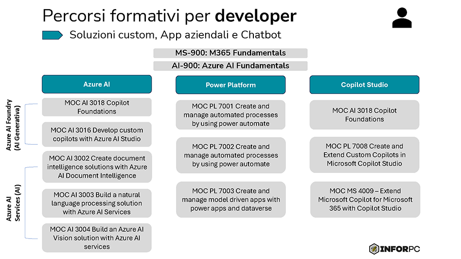 Il percorso è pensato per il professionista IT che desiderano conoscere e approfondire le possibilità che l’AI offre nella realizzazione di soluzioni innovative attraverso l’utilizzo di servizi cloud, come Azure, e per i professionisti IT e amministratori di Microsoft 365 che desiderano acquisire competenze per gestire ed estendere Microsoft 365 Copilot. Questo percorso offre dunque una formazione di base e avanzata nella configurazione e nella gestione e sicurezza della AI.